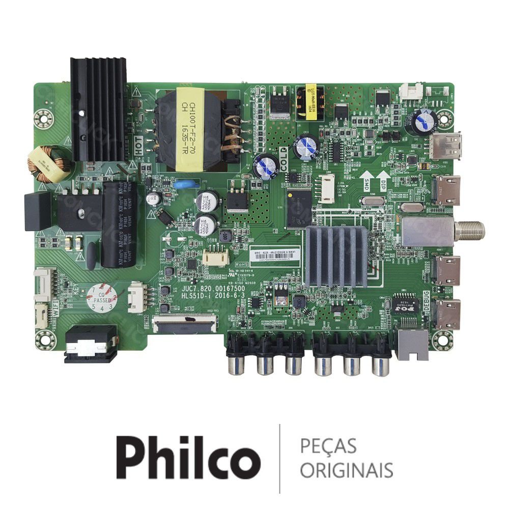 A Placa Principal da TV Philco, conhecida também como PCI principal, PCB Main é essencial ao funcionamento do televisor, esta peça é composta geralmente pelo processador, é nela que fica as entradas HDMI, tuner, vídeo-componente, vídeo-composto. Os circuitos da placa principal é que fazem todas as outras placas operarem.